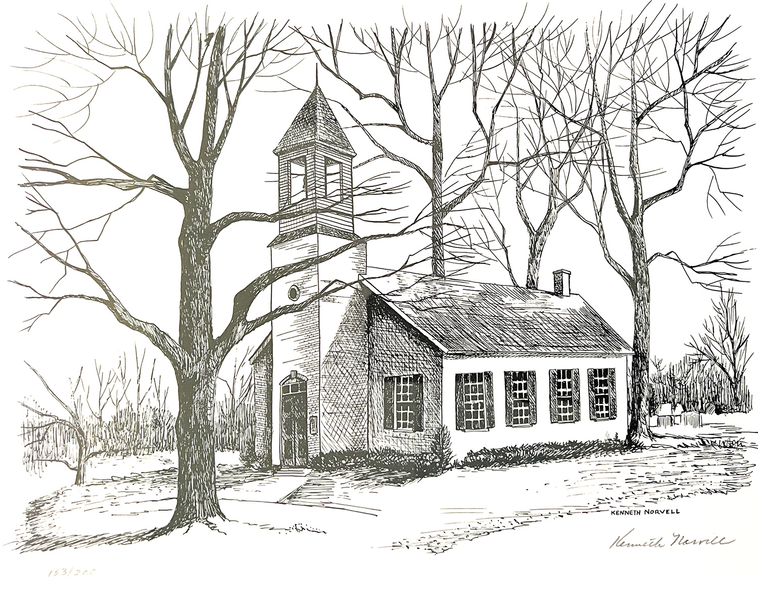 The clay for its bricks was dug from the farm of Samuel Earhart, and baked in a kiln there behind the old frame house that now stands at the northwest corner of Drake and Varner. The timber for it was sawn at the Armstrong family’s Lower Mill near Newtown. The foundation was made of stones from the nearby fields.